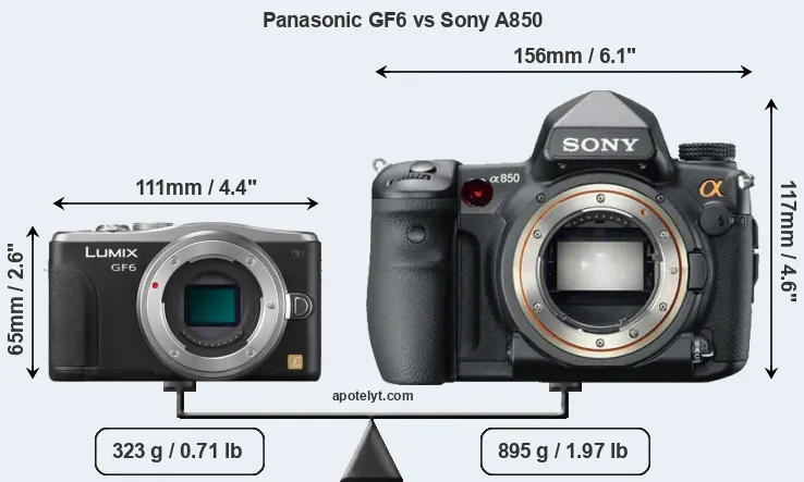 If the front view area (width x height) of the cameras is taken as an aggregate measure of their size, the Sony A850 is considerably larger (153 percent) than the Panasonic GF6. Moreover, the A850 is substantially heavier (177 percent) than the GF6. It is noteworthy in this context that the A850 is splash and dust-proof, while the GF6 does not feature any corresponding weather-sealing.