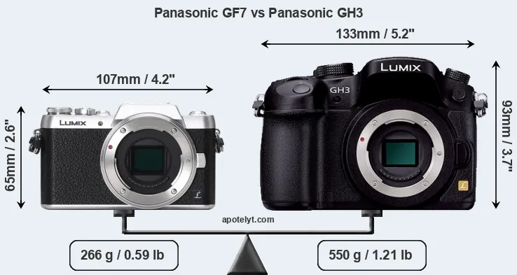 If the front view area (width x height) of the cameras is taken as an aggregate measure of their size, the Panasonic GH3 is considerably larger (78 percent) than the Panasonic GF7. Moreover, the GH3 is substantially heavier (107 percent) than the GF7. It is noteworthy in this context that the GH3 is splash and dust-proof, while the GF7 does not feature any corresponding weather-sealing.