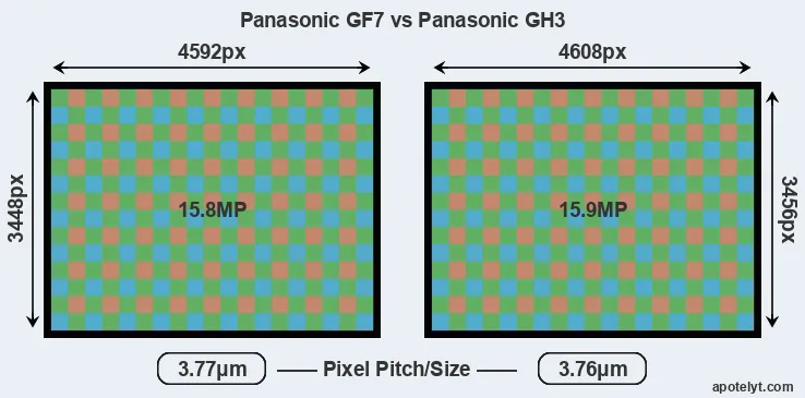 While the two cameras under review share the same sensor size, the GH3 offers a slightly higher resolution of 15.9 megapixels, compared with 15.8 MP of the GF7. This megapixels advantage translates into a 0.3 percent gain in linear resolution. On the other hand, these sensor specs imply that the GH3 has a higher pixel density and a smaller size of the individual pixel (with a pixel pitch of 3.76μm versus 3.77μm for the GF7). Moreover, it should be noted, that the GF7 is much more recent (by 2 years and 4 months) than the GH3, and its sensor will have benefitted from technological advances during this time that further enhance the light gathering capacity of individual pixels.