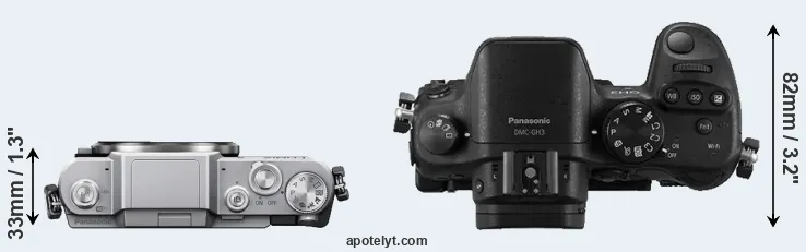 The physical size and weight of the Panasonic GF7 and the Panasonic GH3 are illustrated in the side-by-side display below. The two cameras are presented according to their relative size. Three consecutive views from the front, the top, and the rear side are shown. All width, height and depth dimensions are rounded to the nearest millimeter.