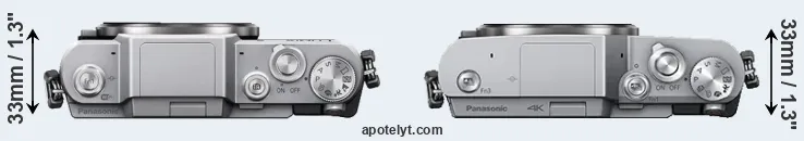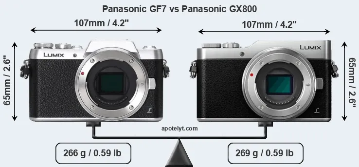 An illustration of the physical size and weight of the Panasonic GF7 and the Panasonic GX800 is provided in the side-by-side display below. The two cameras are presented according to their relative size. Three successive views from the front, the top, and the rear are shown. All width, height and depth measures are rounded to the nearest millimeter.