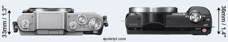 The physical size and weight of the Panasonic GF7 and the Sony A5000 are illustrated in the side-by-side display below. The two cameras are presented according to their relative size. Three successive views from the front, the top, and the rear are shown. All width, height and depth dimensions are rounded to the nearest millimeter.