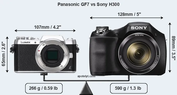The physical size and weight of the Panasonic GF7 and the Sony H300 are illustrated in the side-by-side display below. The two cameras are presented according to their relative size. Three consecutive perspectives from the front, the top, and the back are available. All width, height and depth dimensions are rounded to the nearest millimeter.