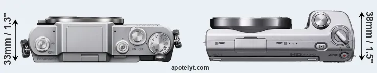 The side-by-side display below illustrates the physical size and weight of the Panasonic GF7 and the Sony NEX-5. The two cameras are presented according to their relative size. Three consecutive views from the front, the top, and the rear side are shown. All width, height and depth dimensions are rounded to the nearest millimeter.