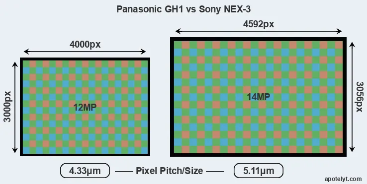 With 14MP, the NEX-3 offers a higher resolution than the GH1 (12MP), but the NEX-3 nevertheless has larger individual pixels (pixel pitch of 5.11μm versus 4.33μm for the GH1) due to its larger sensor. Moreover, the NEX-3 is a somewhat more recent model (by 1 year and 2 months) than the GH1, and its sensor might have benefitted from technological advances during this time that further enhance the light gathering capacity of its pixel-units.