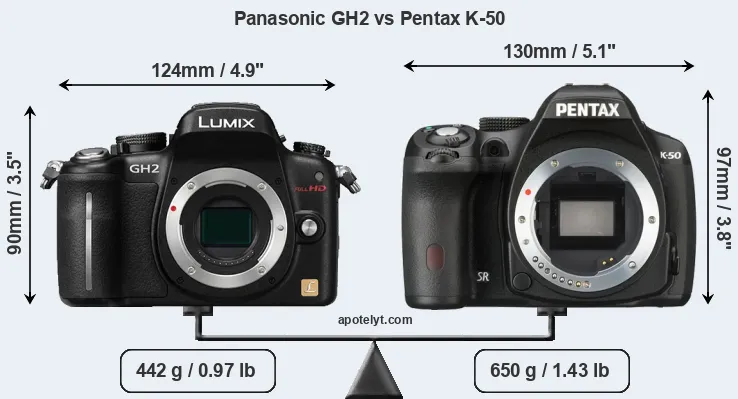 If the front view area (width x height) of the cameras is taken as an aggregate measure of their size, the Pentax K-50 is notably larger (13 percent) than the Panasonic GH2. Moreover, the K-50 is substantially heavier (47 percent) than the GH2. It is noteworthy in this context that the K-50 is splash and dust-proof, while the GH2 does not feature any corresponding weather-sealing.