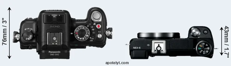 The side-by-side display below illustrates the physical size and weight of the Panasonic GH2 and the Sony NEX-6. The two cameras are presented according to their relative size. Three consecutive views from the front, the top, and the rear side are shown. All width, height and depth measures are rounded to the nearest millimeter.