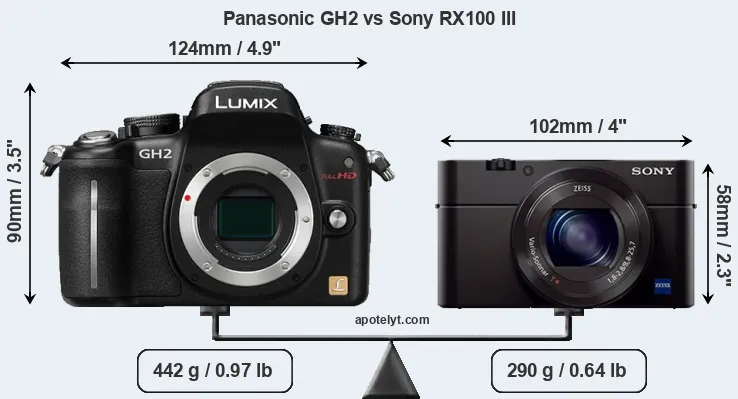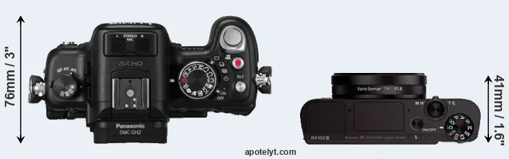 If the front view area (width x height) of the cameras is taken as an aggregate measure of their size, the Sony RX100 III is considerably smaller (47 percent) than the Panasonic GH2. In this context, it is worth noting that neither the GH2 nor the RX100 III are weather-sealed.