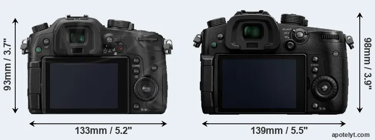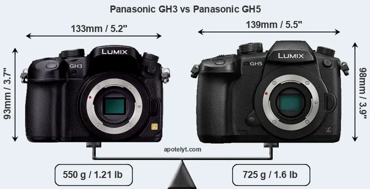 The side-by-side display below illustrates the physical size and weight of the Panasonic GH3 and the Panasonic GH5. The two cameras are presented according to their relative size. Three consecutive perspectives from the front, the top, and the back are available. All width, height and depth dimensions are rounded to the nearest millimeter.