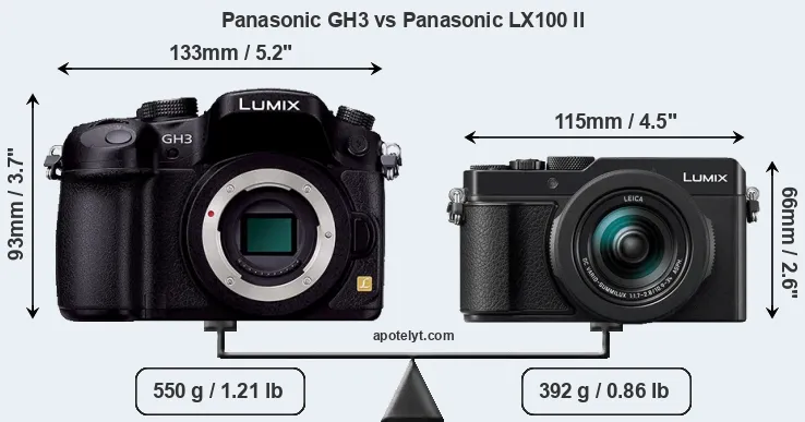 The above size and weight comparisons are to some extent incomplete and possibly misleading, as the LX100 II has a lens built in, whereas the GH3 is an interchangeable lens camera that requires a separate lens. Attaching the latter will add extra weight and bulk to the setup. You can compare the optics available for the GH3 and their specifications in the Micro Four Thirds Lens Catalog.