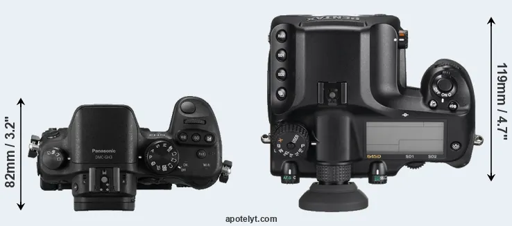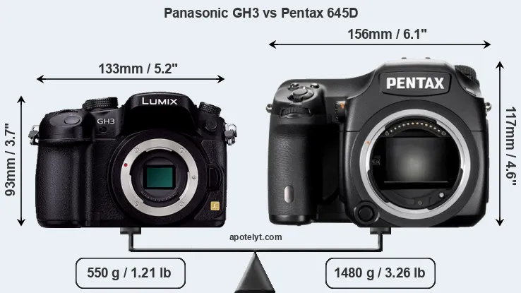 An illustration of the physical size and weight of the Panasonic GH3 and the Pentax 645D is provided in the side-by-side display below. The two cameras are presented according to their relative size. Three consecutive perspectives from the front, the top, and the back are available. All size dimensions are rounded to the nearest millimeter.