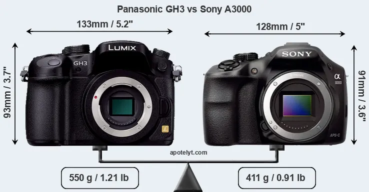If the front view area (width x height) of the cameras is taken as an aggregate measure of their size, the Sony A3000 is notably smaller (6 percent) than the Panasonic GH3. Moreover, the A3000 is markedly lighter (25 percent) than the GH3. It is worth mentioning in this context that the GH3 is splash and dust resistant, while the A3000 does not feature any corresponding weather-sealing.