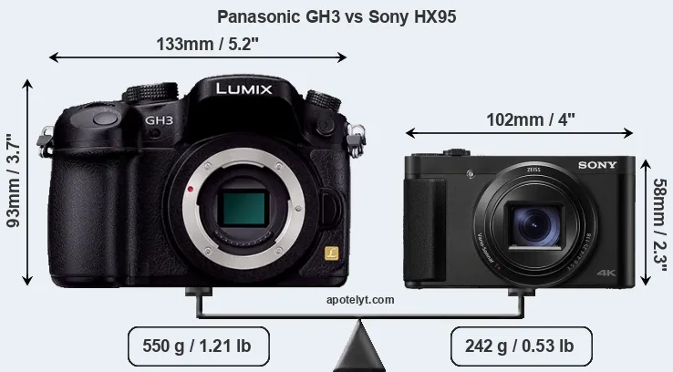 The physical size and weight of the Panasonic GH3 and the Sony HX95 are illustrated in the side-by-side display below. The two cameras are presented according to their relative size. Three consecutive perspectives from the front, the top, and the back are available. All width, height and depth measures are rounded to the nearest millimeter.