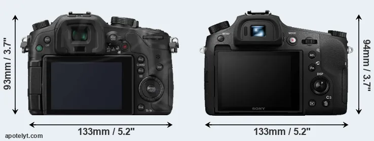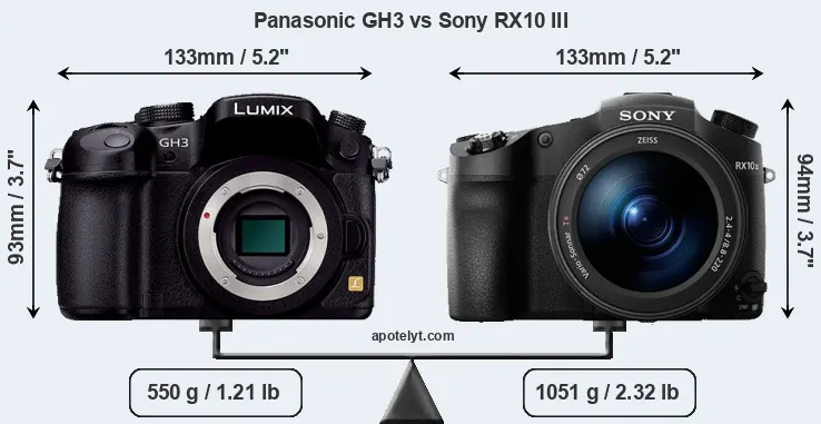 An illustration of the physical size and weight of the Panasonic GH3 and the Sony RX10 III is provided in the side-by-side display below. The two cameras are presented according to their relative size. Three successive views from the front, the top, and the rear are shown. All size dimensions are rounded to the nearest millimeter.