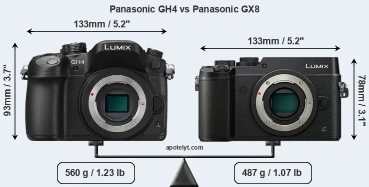 The side-by-side display below illustrates the physical size and weight of the Panasonic GH4 and the Panasonic GX8. The two cameras are presented according to their relative size. Three successive views from the front, the top, and the rear are shown. All width, height and depth measures are rounded to the nearest millimeter.