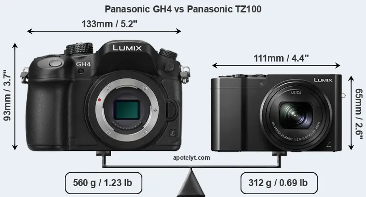 An illustration of the physical size and weight of the Panasonic GH4 and the Panasonic TZ100 is provided in the side-by-side display below. The two cameras are presented according to their relative size. Three consecutive views from the front, the top, and the rear side are shown. All width, height and depth measures are rounded to the nearest millimeter.