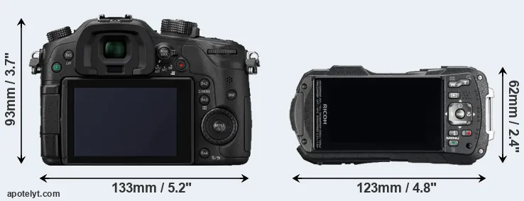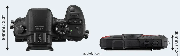 The physical size and weight of the Panasonic GH4 and the Ricoh WG-60 are illustrated in the side-by-side display below. The two cameras are presented according to their relative size. Three consecutive perspectives from the front, the top, and the back are available. All width, height and depth dimensions are rounded to the nearest millimeter.