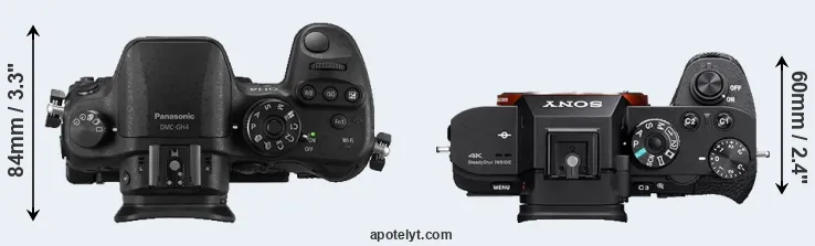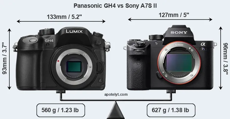An illustration of the physical size and weight of the Panasonic GH4 and the Sony A7S II is provided in the side-by-side display below. The two cameras are presented according to their relative size. Three consecutive perspectives from the front, the top, and the back are available. All width, height and depth measures are rounded to the nearest millimeter.