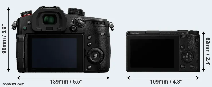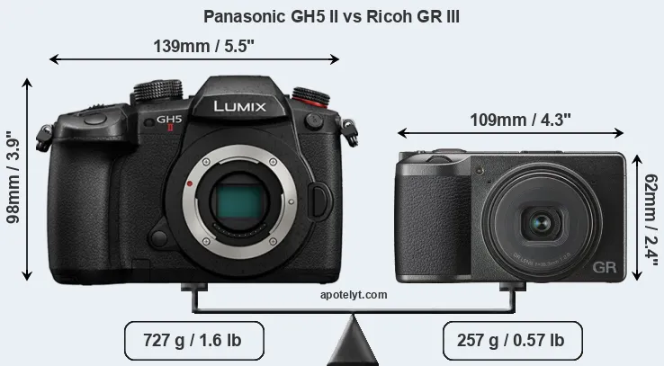 The physical size and weight of the Panasonic GH5 II and the Ricoh GR III are illustrated in the side-by-side display below. The two cameras are presented according to their relative size. Three successive views from the front, the top, and the rear are shown. All size dimensions are rounded to the nearest millimeter.