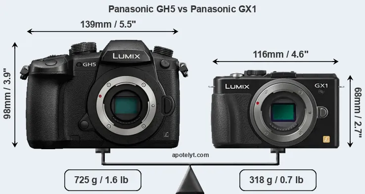 The side-by-side display below illustrates the physical size and weight of the Panasonic GH5 and the Panasonic GX1. The two cameras are presented according to their relative size. Three consecutive perspectives from the front, the top, and the back are available. All width, height and depth measures are rounded to the nearest millimeter.