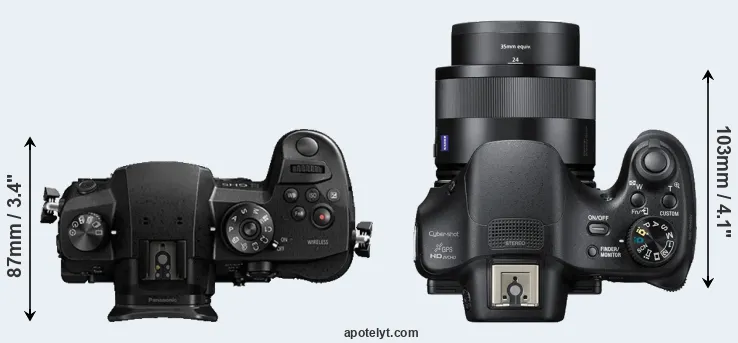 An illustration of the physical size and weight of the Panasonic GH5 and the Sony HX400V is provided in the side-by-side display below. The two cameras are presented according to their relative size. Three successive views from the front, the top, and the rear are shown. All size dimensions are rounded to the nearest millimeter.