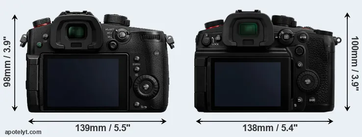 The side-by-side display below illustrates the physical size and weight of the Panasonic GH5s and the Panasonic GH7. The two cameras are presented according to their relative size. Three consecutive perspectives from the front, the top, and the back are available. All width, height and depth measures are rounded to the nearest millimeter.