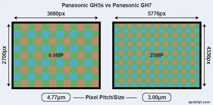 While the two cameras under review share the same sensor size, the GH7 offers a higher resolution of 25 megapixels, compared with 9.9 MP of the GH5s. This megapixels advantage translates into a 57 percent gain in linear resolution. On the other hand, these sensor specs imply that the GH7 has a higher pixel density and a smaller size of the individual pixel (with a pixel pitch of 3.00μm versus 4.77μm for the GH5s). However, it should be noted that the GH7 is much more recent (by 6 years and 4 months) than the GH5s, and its sensor will have benefitted from technological advances during this time that compensate for the smaller pixel size. Coming back to sensor resolution, it should be mentioned that neither of the two cameras has an anti-alias filter installed, so they are able to capture all the detail the sensor resolves.