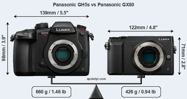 If the front view area (width x height) of the cameras is taken as an aggregate measure of their size, the Panasonic GX80 is considerably smaller (36 percent) than the Panasonic GH5s. Moreover, the GX80 is substantially lighter (35 percent) than the GH5s. It is worth mentioning in this context that the GH5s is splash and dust resistant, while the GX80 does not feature any corresponding weather-sealing.