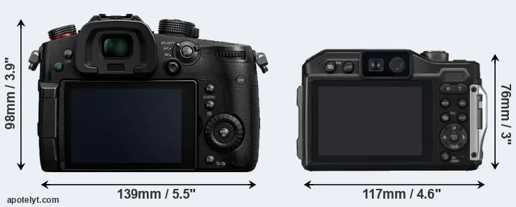 If the front view area (width x height) of the cameras is taken as an aggregate measure of their size, the Panasonic TS7 is considerably smaller (35 percent) than the Panasonic GH5s. In this context, it is worth noting that both cameras are splash and dust-proof and can, hence, be used in inclement weather conditions or harsh environments. More than that, the TS7 is water-proof up to 31m and can, thus, be used for underwater photography.