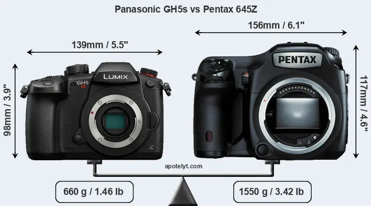 The physical size and weight of the Panasonic GH5s and the Pentax 645Z are illustrated in the side-by-side display below. The two cameras are presented according to their relative size. Three successive views from the front, the top, and the rear are shown. All width, height and depth measures are rounded to the nearest millimeter.