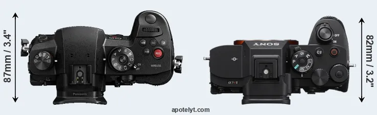 The physical size and weight of the Panasonic GH5s and the Sony A7R V are illustrated in the side-by-side display below. The two cameras are presented according to their relative size. Three successive views from the front, the top, and the rear are shown. All width, height and depth measures are rounded to the nearest millimeter.