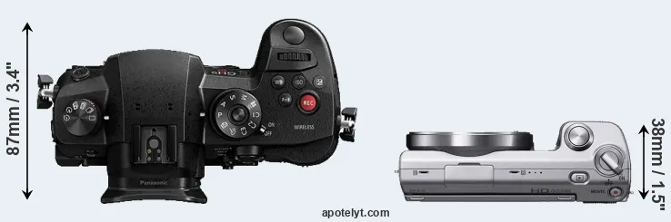 The physical size and weight of the Panasonic GH5s and the Sony NEX-5 are illustrated in the side-by-side display below. The two cameras are presented according to their relative size. Three successive views from the front, the top, and the rear are shown. All width, height and depth measures are rounded to the nearest millimeter.