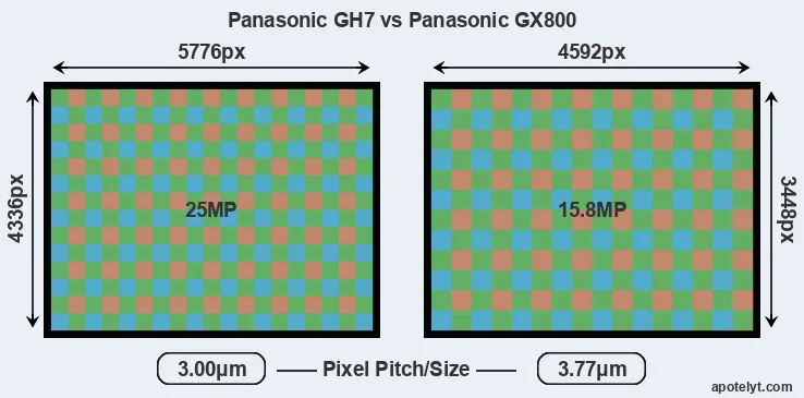 While the two cameras under review share the same sensor size, the GH7 offers a higher resolution of 25 megapixels, compared with 15.8 MP of the GX800. This megapixels advantage translates into a 26 percent gain in linear resolution. On the other hand, these sensor specs imply that the GH7 has a higher pixel density and a smaller size of the individual pixel (with a pixel pitch of 3.00μm versus 3.77μm for the GX800). In this context, it should be noted, however, that the GH7 is much more recent (by 7 years and 5 months) than the GX800, and its sensor will have benefitted from technological advances during this time that compensate for the smaller pixel size. Coming back to sensor resolution, it should be mentioned that neither of the two cameras has an anti-alias filter installed, so they are able to capture all the detail the sensor resolves.