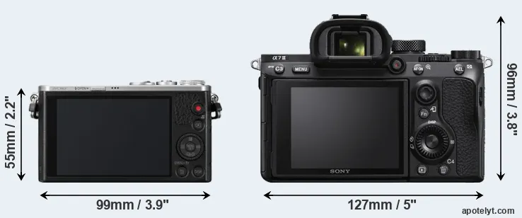 The physical size and weight of the Panasonic GM1 and the Sony A7 III are illustrated in the side-by-side display below. The two cameras are presented according to their relative size. Three successive views from the front, the top, and the rear are shown. All width, height and depth dimensions are rounded to the nearest millimeter.