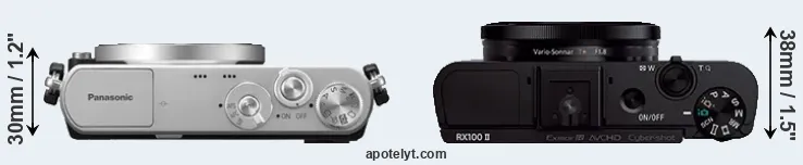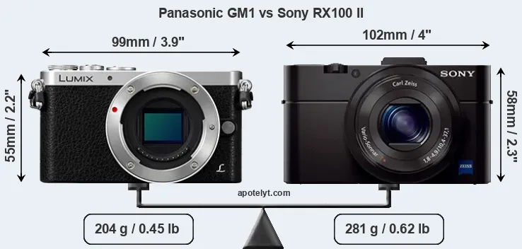The physical size and weight of the Panasonic GM1 and the Sony RX100 II are illustrated in the side-by-side display below. The two cameras are presented according to their relative size. Three consecutive perspectives from the front, the top, and the back are available. All width, height and depth measures are rounded to the nearest millimeter.