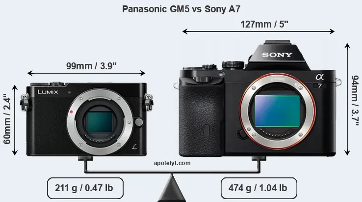 If the front view area (width x height) of the cameras is taken as an aggregate measure of their size, the Sony A7 is considerably larger (101 percent) than the Panasonic GM5. Moreover, the A7 is substantially heavier (125 percent) than the GM5. It is noteworthy in this context that the A7 is splash and dust-proof, while the GM5 does not feature any corresponding weather-sealing.