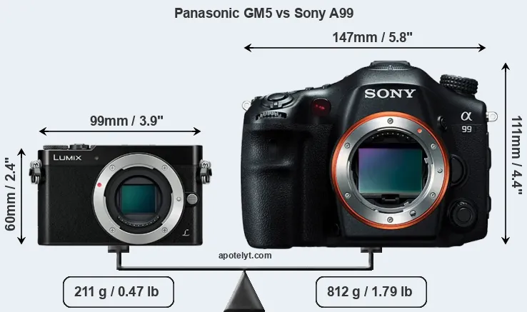If the front view area (width x height) of the cameras is taken as an aggregate measure of their size, the Sony A99 is considerably larger (175 percent) than the Panasonic GM5. Moreover, the A99 is substantially heavier (285 percent) than the GM5. It is noteworthy in this context that the A99 is splash and dust-proof, while the GM5 does not feature any corresponding weather-sealing.