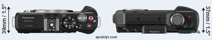 An illustration of the physical size and weight of the Panasonic GX1 and the Panasonic TS7 is provided in the side-by-side display below. The two cameras are presented according to their relative size. Three consecutive perspectives from the front, the top, and the back are available. All size dimensions are rounded to the nearest millimeter.