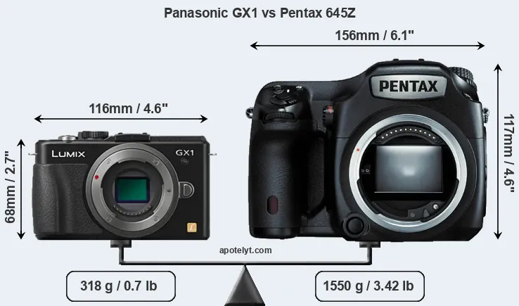 If the front view area (width x height) of the cameras is taken as an aggregate measure of their size, the Pentax 645Z is considerably larger (131 percent) than the Panasonic GX1. Moreover, the 645Z is substantially heavier (387 percent) than the GX1. It is noteworthy in this context that the 645Z is splash and dust-proof, while the GX1 does not feature any corresponding weather-sealing.