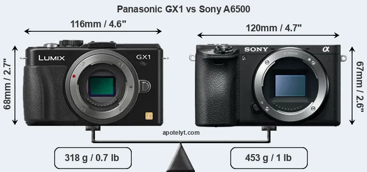 If the front view area (width x height) of the cameras is taken as an aggregate measure of their size, the Sony A6500 is somewhat larger (2 percent) than the Panasonic GX1. Moreover, the A6500 is substantially heavier (42 percent) than the GX1. It is noteworthy in this context that the A6500 is splash and dust-proof, while the GX1 does not feature any corresponding weather-sealing.