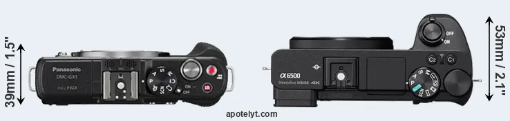 The physical size and weight of the Panasonic GX1 and the Sony A6500 are illustrated in the side-by-side display below. The two cameras are presented according to their relative size. Three successive views from the front, the top, and the rear are shown. All size dimensions are rounded to the nearest millimeter.