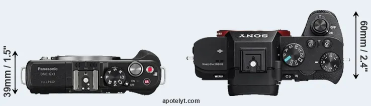 The physical size and weight of the Panasonic GX1 and the Sony A7 II are illustrated in the side-by-side display below. The two cameras are presented according to their relative size. Three successive views from the front, the top, and the rear are shown. All size dimensions are rounded to the nearest millimeter.