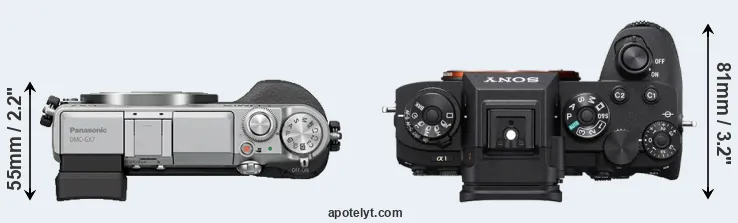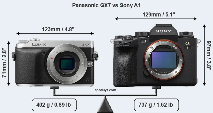 The physical size and weight of the Panasonic GX7 and the Sony A1 are illustrated in the side-by-side display below. The two cameras are presented according to their relative size. Three consecutive perspectives from the front, the top, and the back are available. All width, height and depth measures are rounded to the nearest millimeter.