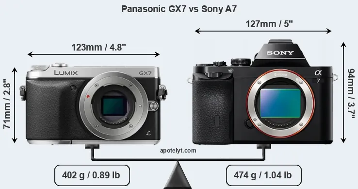 If the front view area (width x height) of the cameras is taken as an aggregate measure of their size, the Sony A7 is notably larger (37 percent) than the Panasonic GX7. Moreover, the A7 is markedly heavier (18 percent) than the GX7. It is noteworthy in this context that the A7 is splash and dust-proof, while the GX7 does not feature any corresponding weather-sealing.