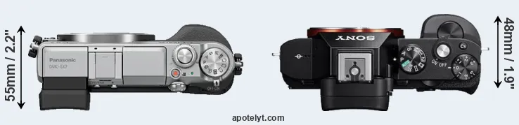 The side-by-side display below illustrates the physical size and weight of the Panasonic GX7 and the Sony A7. The two cameras are presented according to their relative size. Three consecutive views from the front, the top, and the rear side are shown. All width, height and depth dimensions are rounded to the nearest millimeter.