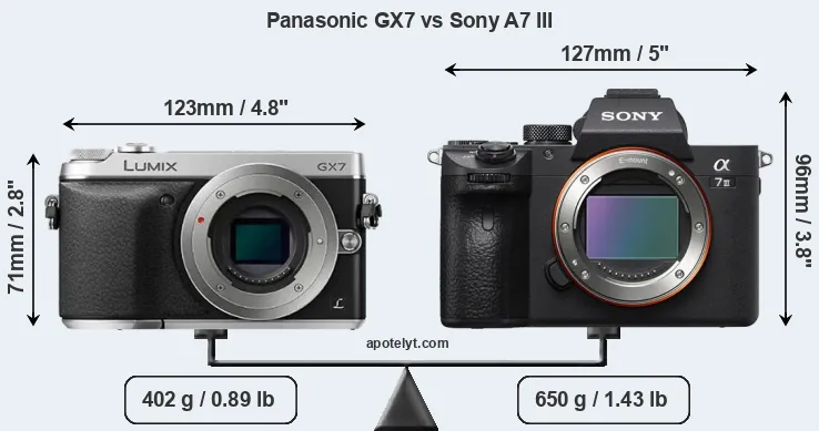 If the front view area (width x height) of the cameras is taken as an aggregate measure of their size, the Sony A7 III is notably larger (40 percent) than the Panasonic GX7. Moreover, the A7 III is substantially heavier (62 percent) than the GX7. It is noteworthy in this context that the A7 III is splash and dust-proof, while the GX7 does not feature any corresponding weather-sealing.