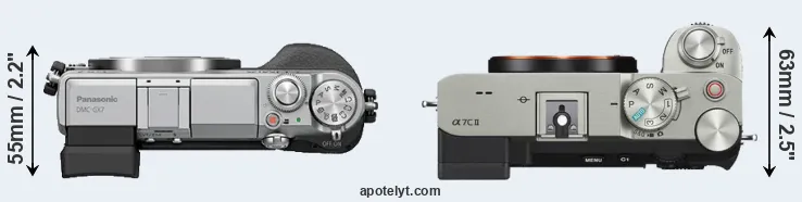 The physical size and weight of the Panasonic GX7 and the Sony A7C II are illustrated in the side-by-side display below. The two cameras are presented according to their relative size. Three successive views from the front, the top, and the rear are shown. All width, height and depth measures are rounded to the nearest millimeter.