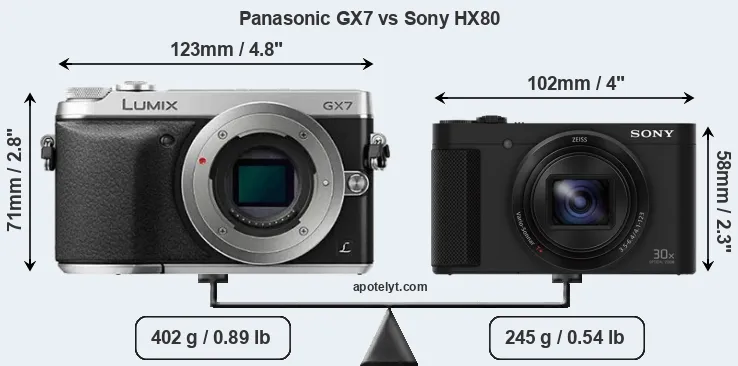 The physical size and weight of the Panasonic GX7 and the Sony HX80 are illustrated in the side-by-side display below. The two cameras are presented according to their relative size. Three successive views from the front, the top, and the rear are shown. All width, height and depth measures are rounded to the nearest millimeter.
