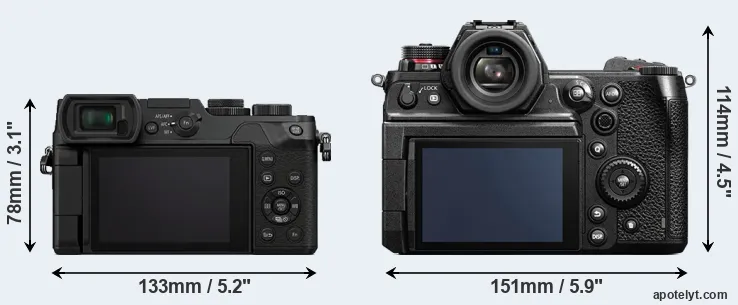 The side-by-side display below illustrates the physical size and weight of the Panasonic GX8 and the Panasonic S1H. The two cameras are presented according to their relative size. Three consecutive perspectives from the front, the top, and the back are available. All width, height and depth dimensions are rounded to the nearest millimeter.
