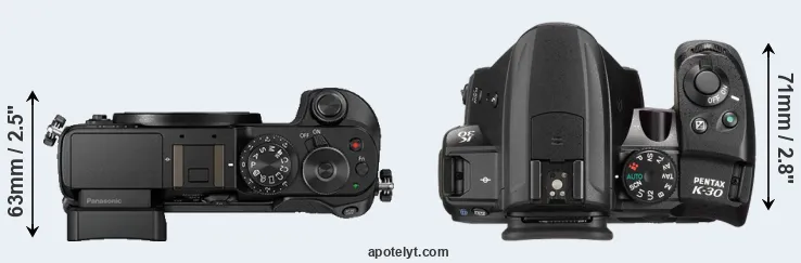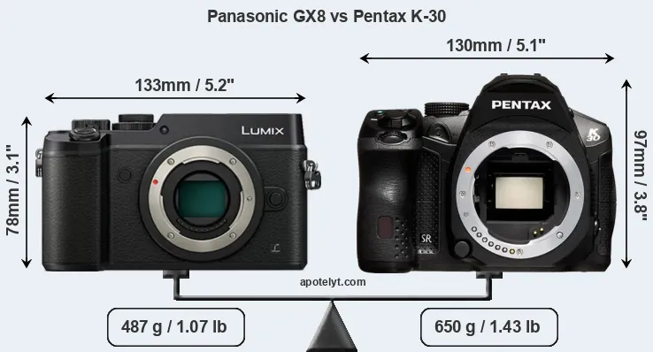 The side-by-side display below illustrates the physical size and weight of the Panasonic GX8 and the Pentax K-30. The two cameras are presented according to their relative size. Three consecutive perspectives from the front, the top, and the back are available. All width, height and depth dimensions are rounded to the nearest millimeter.